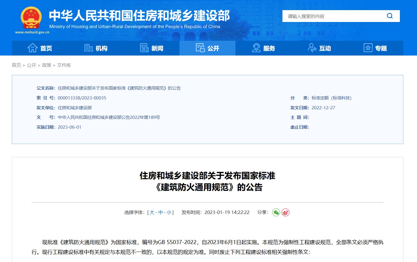2023年1月19日,中華人民共和國住房和城鄉(xiāng)建設(shè)部公告2022年底189號文件發(fā)布,批準(zhǔn)《建筑防火通用規(guī)范》為國家標(biāo)準(zhǔn),編號為GB 55037-2022,自2023年6月1日起實(shí)施。本規(guī)范為強(qiáng)制性工程建設(shè)規(guī)范,全部條文必須嚴(yán)格執(zhí)行。