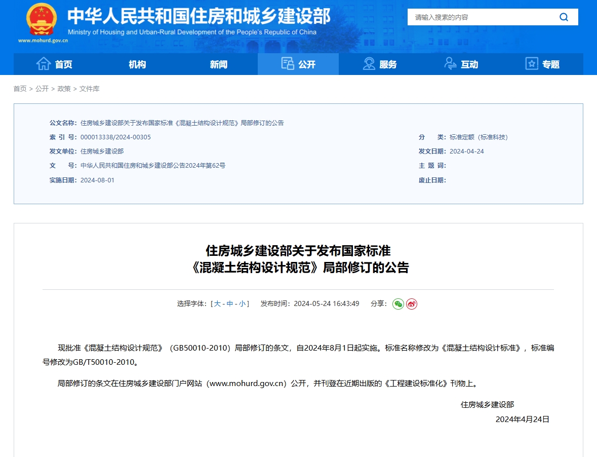 住房和城鄉(xiāng)建設(shè)部于2024年5月24日發(fā)布了《建筑抗震設(shè)計(jì)規(guī)范》(GB50011-2010)和《混凝土結(jié)構(gòu)設(shè)計(jì)規(guī)范》(GB50010-2010)局部修訂的公告,標(biāo)準(zhǔn)名稱及編號(hào)為《建筑抗震設(shè)...