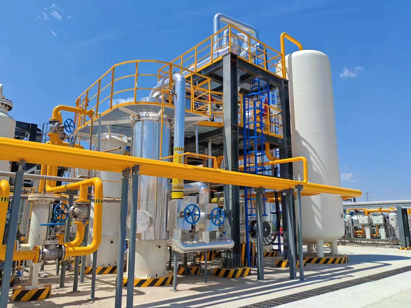 該項目作為天津渤化集團2024年重點建設項目,坐落于天津市氫能產業示范園區,是津摯集團繼天津新氫加氫站一期項目成功合作后的又一力作。項目裝置具有流程長、工藝復雜等特點,集成了除油、除粉塵預處理,脫水,除氧,粗脫硫,精脫硫,PSA氫氣提純,解析氣加壓等先進工藝。這些工藝確保了高純度產品氣體的產出以及提升了對資源的利用率,能夠滿足設計要求。此外,該裝置能夠同時處理合成氨低溫甲醇洗原料和丙烷脫氫尾氣原料,雙PSA既可并聯運行,又可單獨運行,滿足多樣化的生產需求。